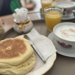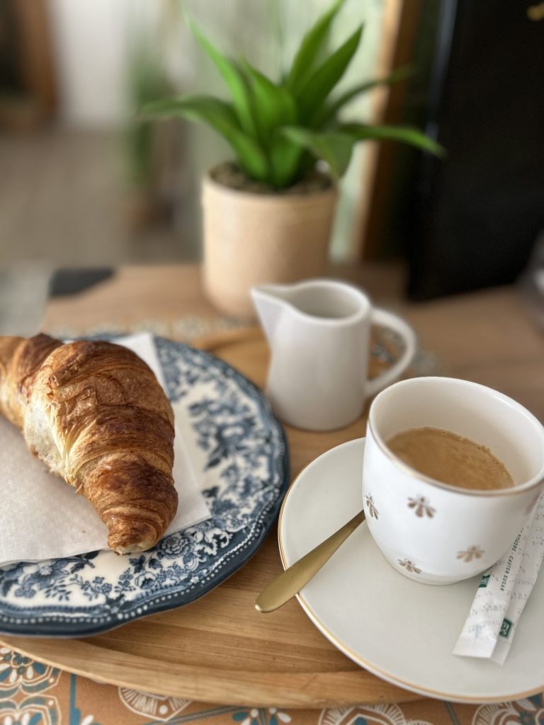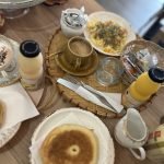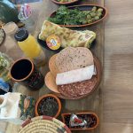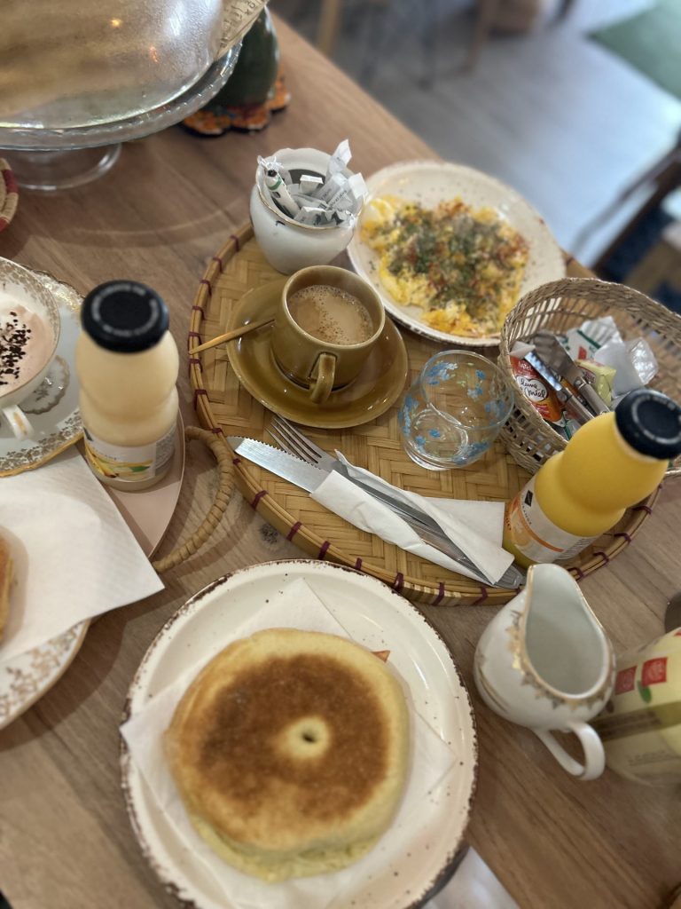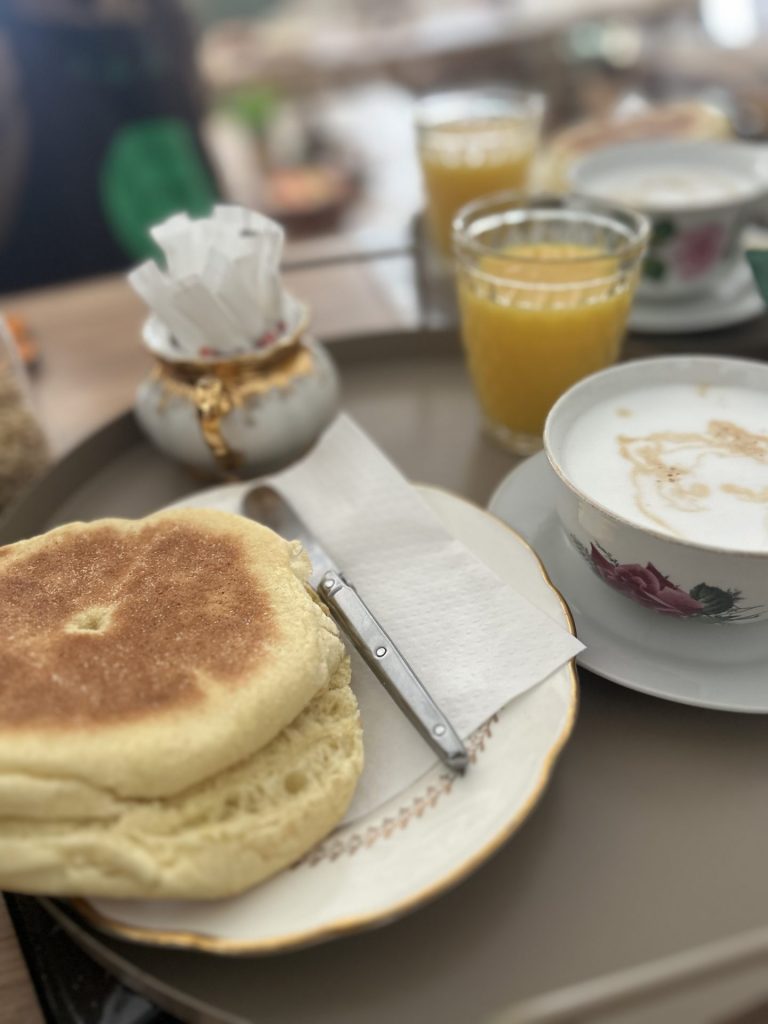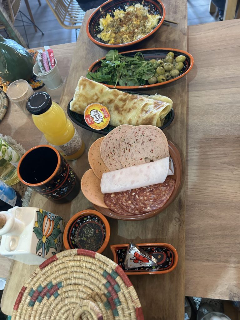 Un menu complet aux accents du Maghreb : œufs brouillés, huile d’olive fleur de sel, olives vertes aux herbes , petites charcuteries, fromage, jus frais thé à la menthe et msemen . Le goût du soleil dans votre assiette.