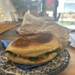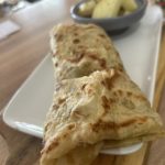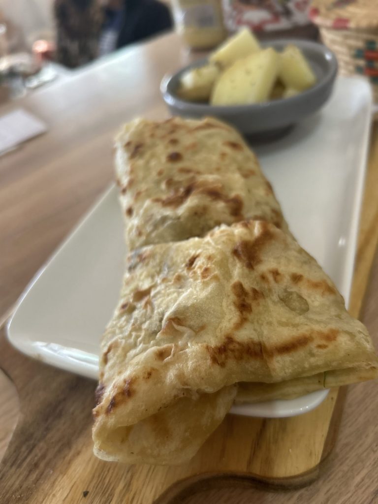 Msemen garnie de viandes hachés aux épices , oignions rouges , cheddar, mâche .