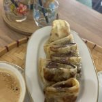 Kefta, œuf au plat , PDT rôties , salade de mâche , crème à l’ail , un pain Matlouh chaud et un verre de thé.