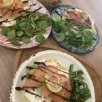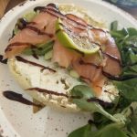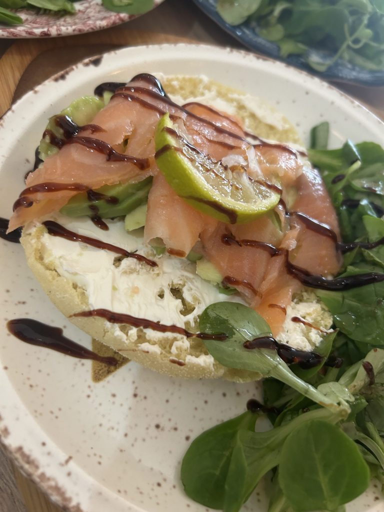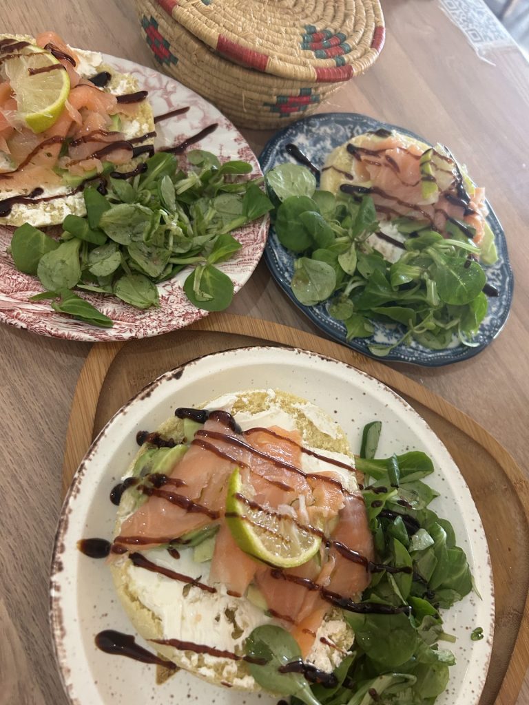 Toast pain Matlouh lit de fromage tranches d’avocat et saumon accompagné d’une petite salade de mâches et sa crème de vinaigre balsamique