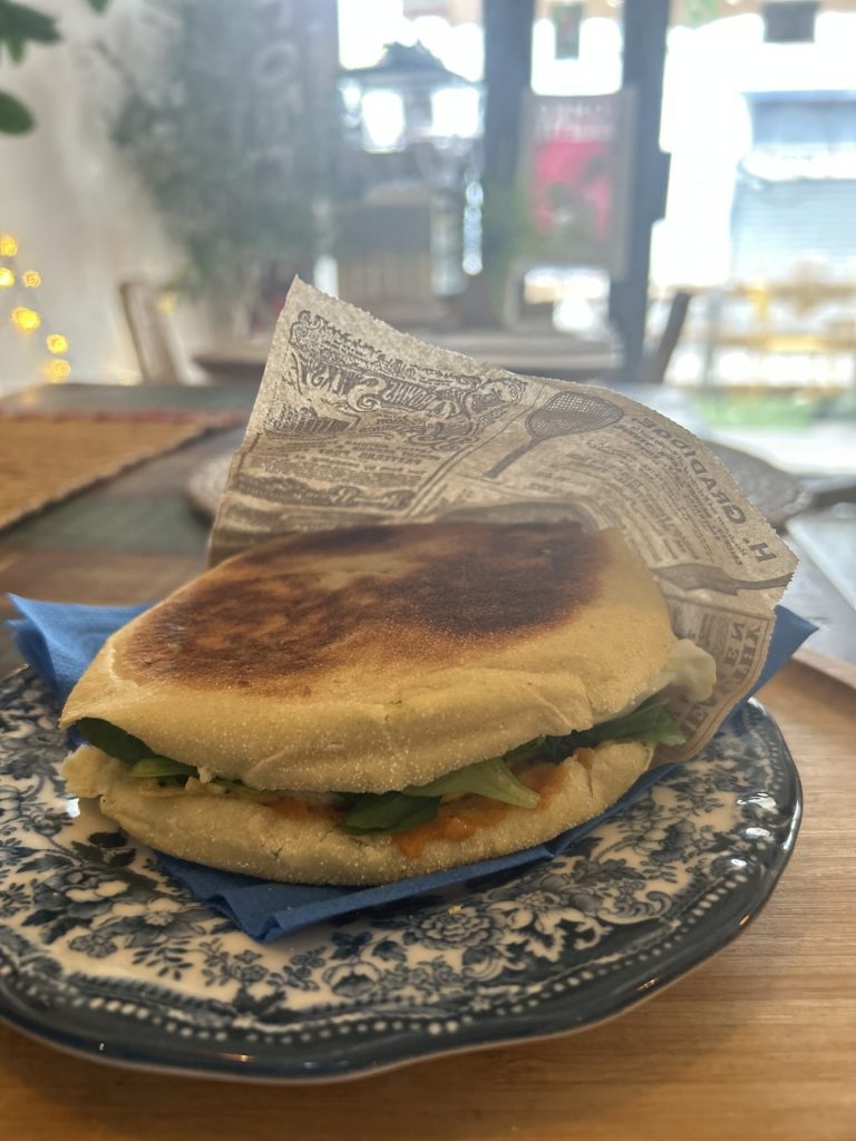 Msemen en sandwich : avec de la kefta émietté , oignon rouge , tomate sauce à l’ail et salade de mâche